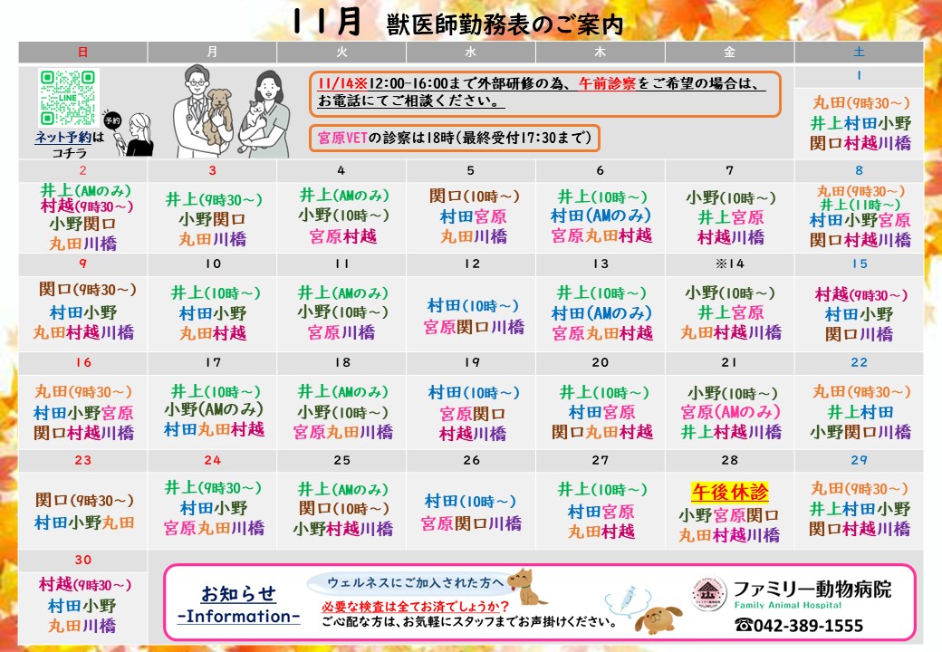 ※11/14は外部研修の為、午前の診療を縮小させて頂く場合がございます。