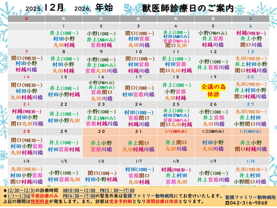 12月~1月上旬の獣医師勤務表を更新いたしました。
