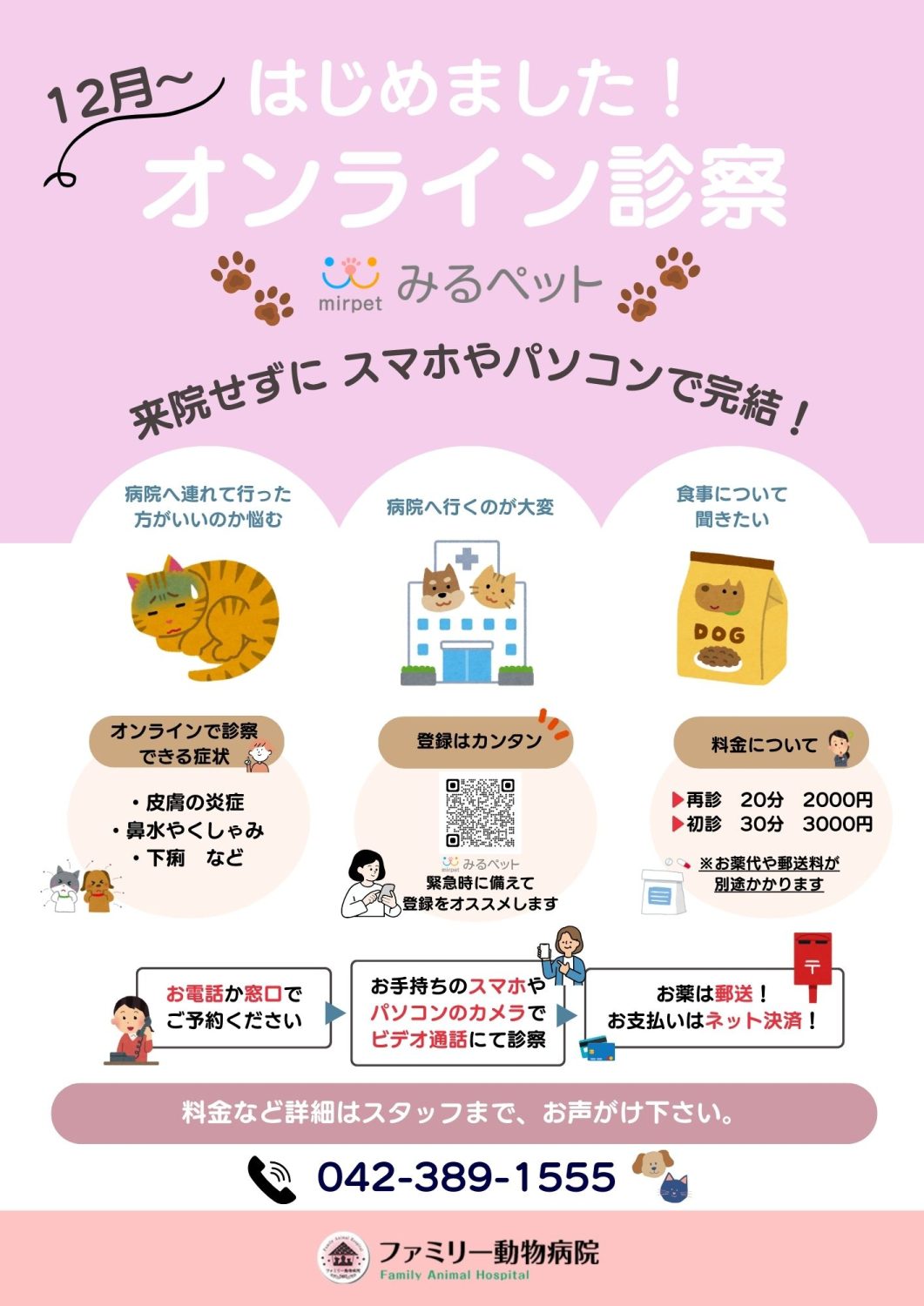 オンライン診察はじめました! 公開済み: 2025年12月15日更新: 2025年12月15日作成者: familyカテゴリー: 未分類 こんにちは、ファミリー動物病院です。 12月より、「オンライン診察」を始めましたのでご案内いたします。 詳細はポスターをご覧頂き、ご質問などございましたらお電話か直接受付窓口にてご案内させていただきます。