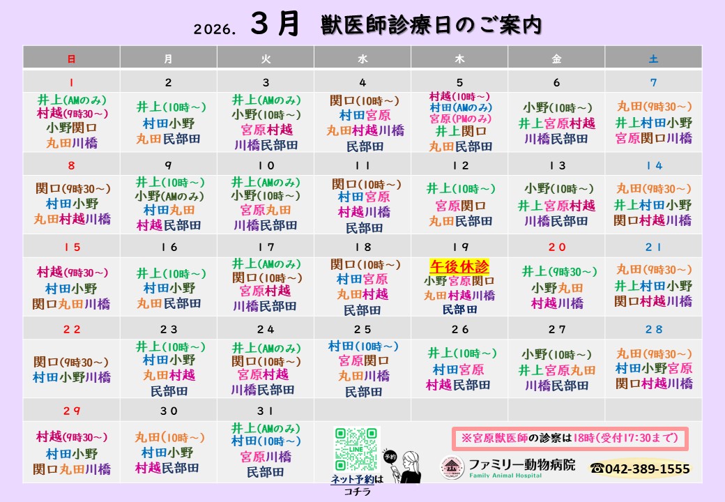 3月 獣医師勤務表のご案内 公開済み: 2026年2月16日更新: 2026年2月16日作成者: familyカテゴリー: 未分類 こんにちは。ファミリー動物病院です🐕🐈3月の獣医師勤務表を更新いたしました。 尚ご予約は、お電話かネット予約にてお願いいたします。